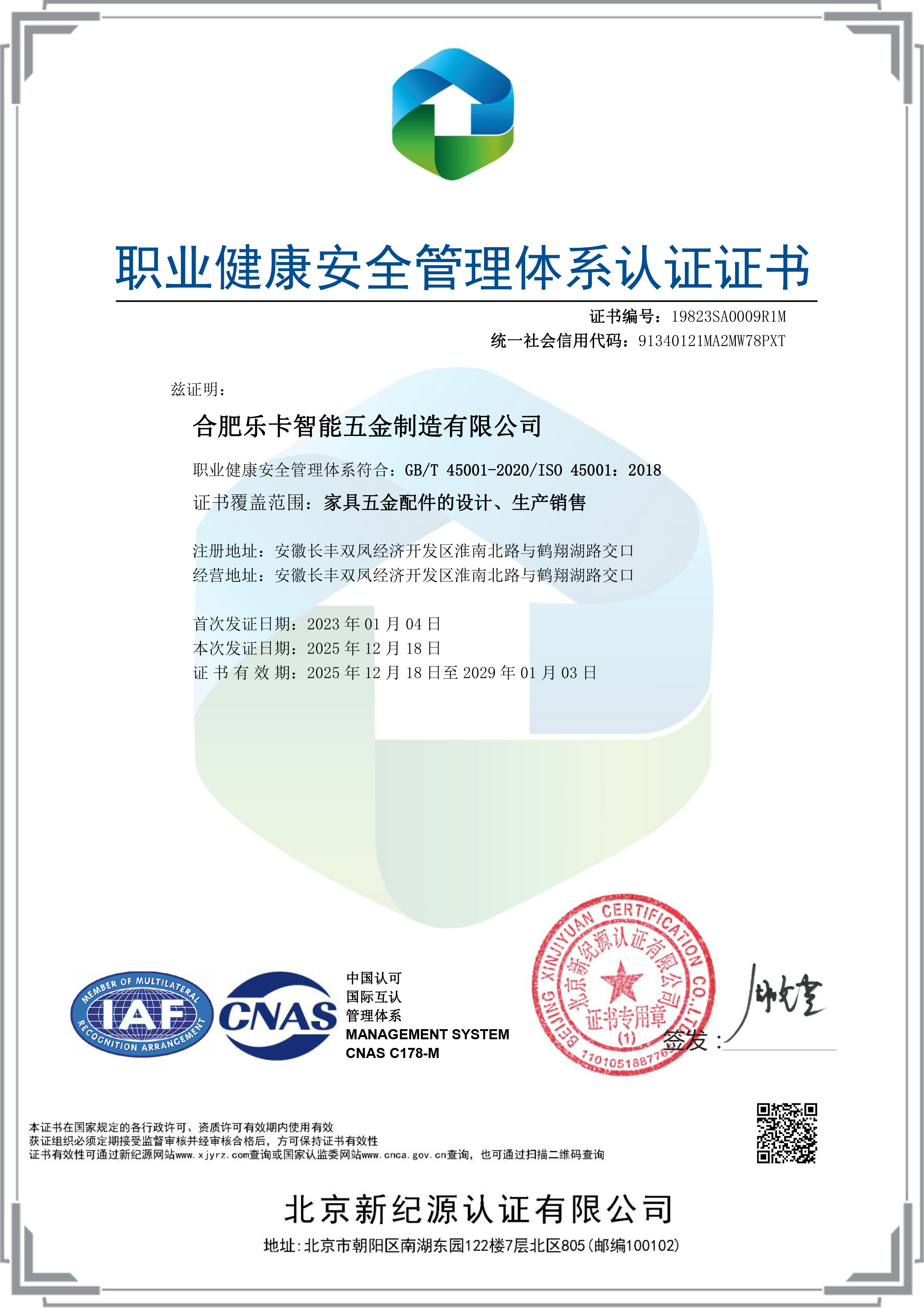 乐卡职业健康体系管理证书